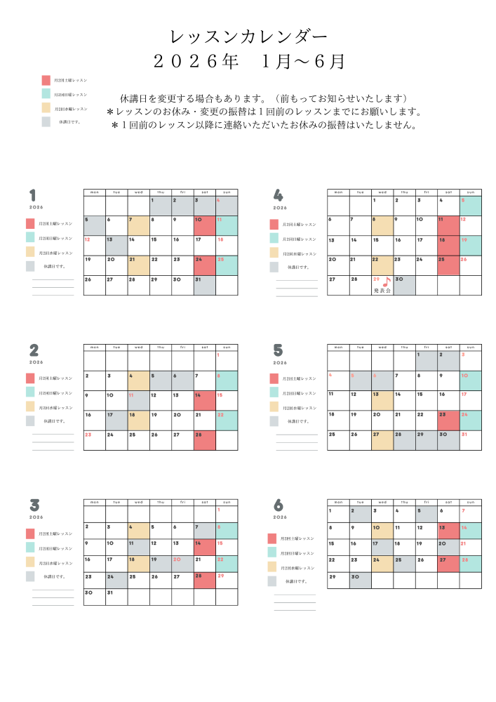 休講日を変更する場合もあります。(前もってお知らせいたします)*レッスンのお休み・変更の振替は1回前のレッスンまでにお願いします。*1回前のレッスン以降に連絡いただいたお休みの振替はいたしません。